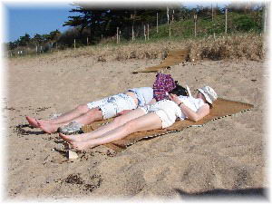 16h00 Le sable se trouvant à deux pas de la maison, serviettes, parasols, table, glacière sous le bras, la famille Bidochon par à la plage, l'histoire de digérer, en plus le soleil nous accompagne depuis ce matin. |